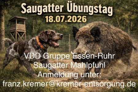 Die VDD Gruppe Essen-Ruhr bietet am Samstag, den 18.07.2026 einen Übungstag im Saugatter Mahlpfuhl an. Die Teilnehmerzahl ist begrenzt! Anmeldung und weitere Informationen unter: franz.kremer@kremer-entsorgung.de